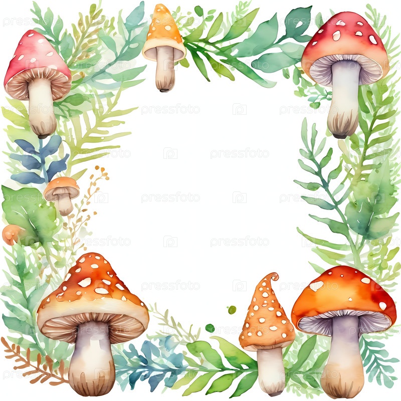 Красочные грибы различных форм и размеров расположены в листовой границе на белом акварельном фоне, создавая праздничную сцену Хэллоуина, идеально подходящую для наборов генеративного ИИ