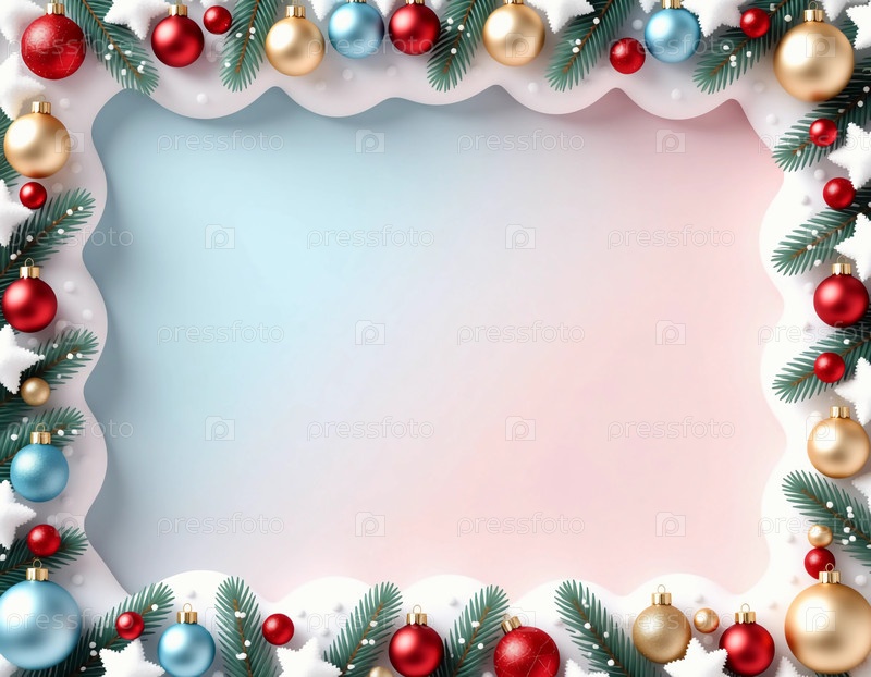 На декоративной границе отображаются красочные рождественские украшения, включая красные, золотые и голубые шары в окружении зеленых сосновых ветвей.Идеально подходит для генеративного ИИ праздничных поздравлений и приглашений на каникулы