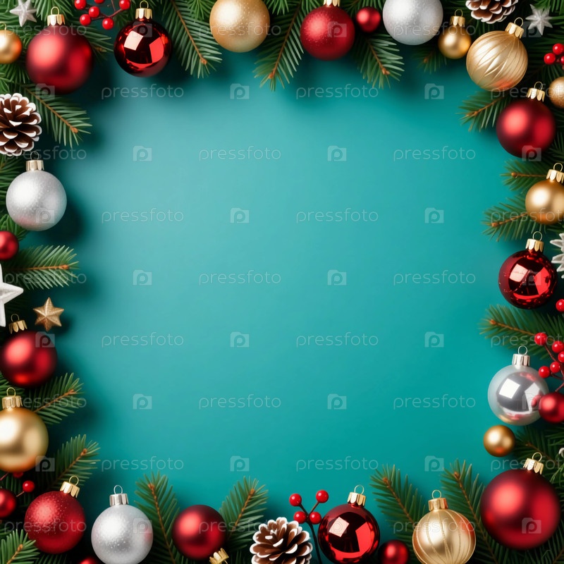 Ярко окрашенные орнаменты красного, золотого, серебряного и зеленого цвета окружают бирюзовый фон, создавая веселую рамку, идеальную для праздничных поздравлений и торжеств