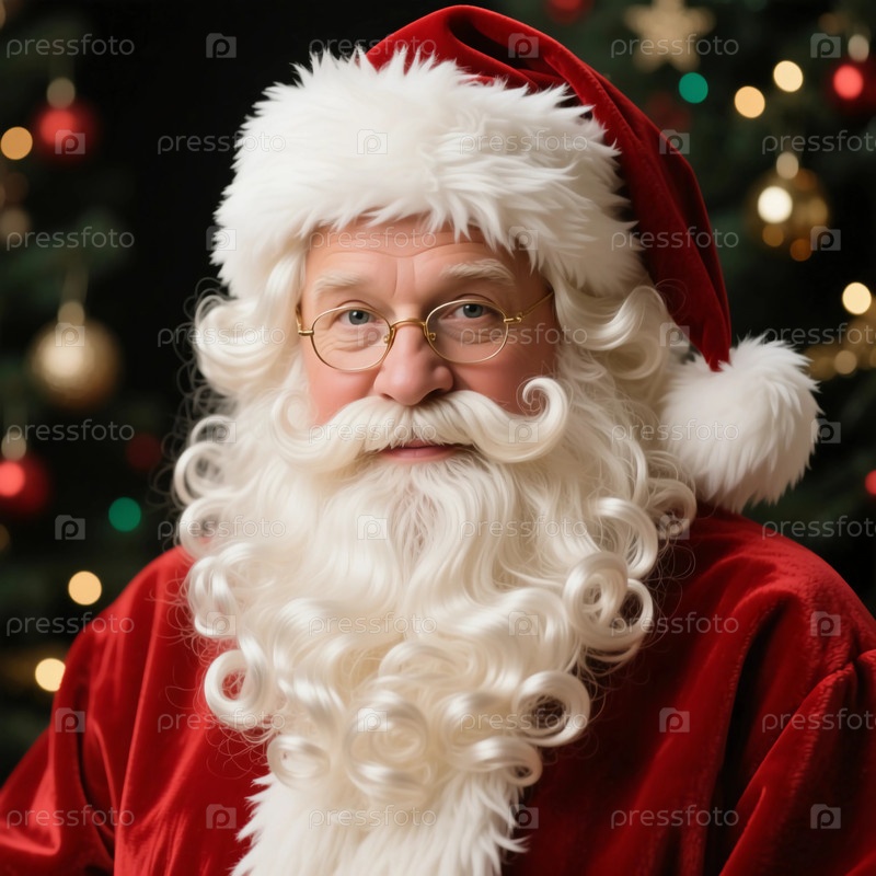 Санта-Клаус с теплой улыбкой и пушистой белой бородой окружен праздничными украшениями, которые воплощают дух рождественских и новогодних торжеств генеративного ИИ