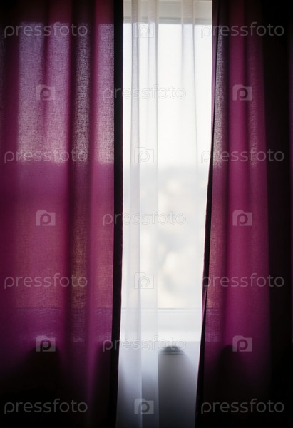 Красивые фиолетовые лиловые шторы висят элегантно, частично открыты для открытия яркого окна, позволяя мягкому свету проникать в уютное внутреннее пространство, улучшая теплую атмосферу генеративного AI