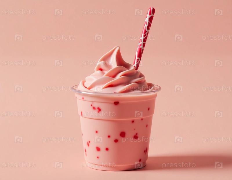 Привлекательный и изящный клубничный йогурт заполняет прозрачную чашку, красиво закрученную кремовой текстурой и подчеркнутую яркими пятнами