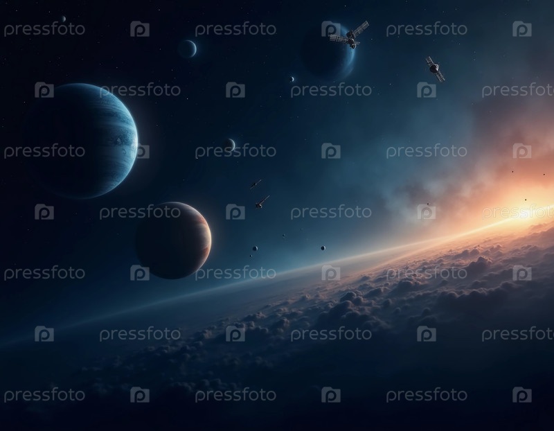 Огромные планеты и светящиеся луны плавают в завораживающих глубинах космоса, а далекий восход солнца освещает небесную атмосферу, создавая внушительный вид на генеративный ИИ