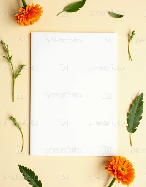 Чистый блокнот опирается на теплый фон, украшенный ярко-оранжевыми цветами календулы и лиственничной зелени, приглашая к творчеству и размышлениям в мирной среде генеративного ИИ