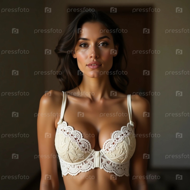 В мягко освещенной комнате потрясающая женщина грациозно позирует, демонстрируя сложную моду бюстгальтера.Ее уверенное выражение подчеркивает тонкий дизайн и детали Generative AI нижнего белья