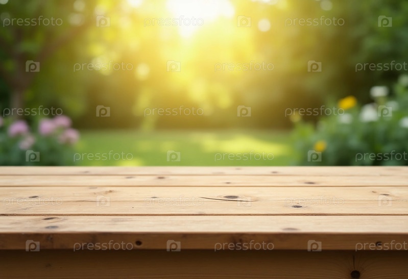 Солнечный свет танцует над гладкой поверхностью деревянного стола, окруженного цветущим садом, где цветные цветы мягко раскачиваются в теплом ветре, создавая спокойную атмосферу генеративного ИИ