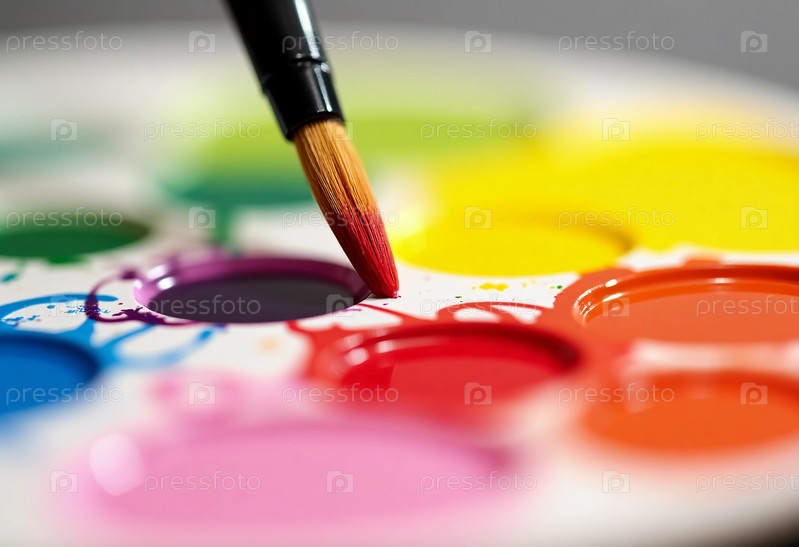 Яркая кисть парит над палитрой, заполненной многими яркими цветами в причудливой художественной обстановке, приглашая к творчеству и самовыражению генеративного ИИ