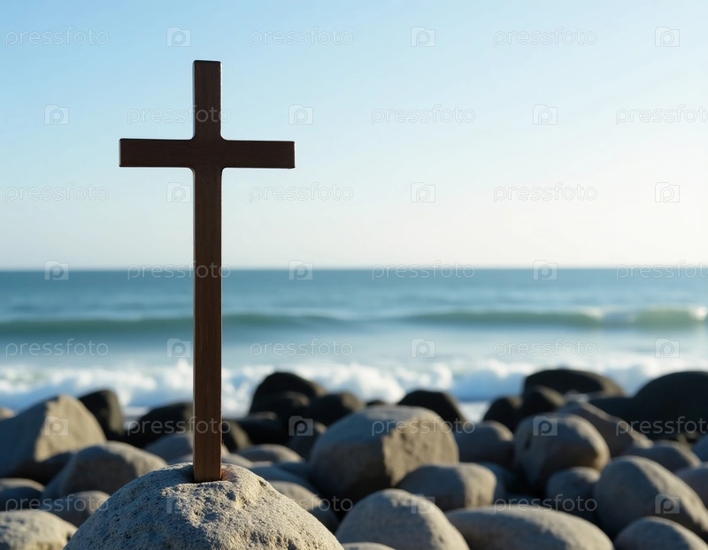 Простой крест возвышается над гладкими камнями на берегу воды, отражая момент преданности, когда мягкие волны брызгают по берегу при закате