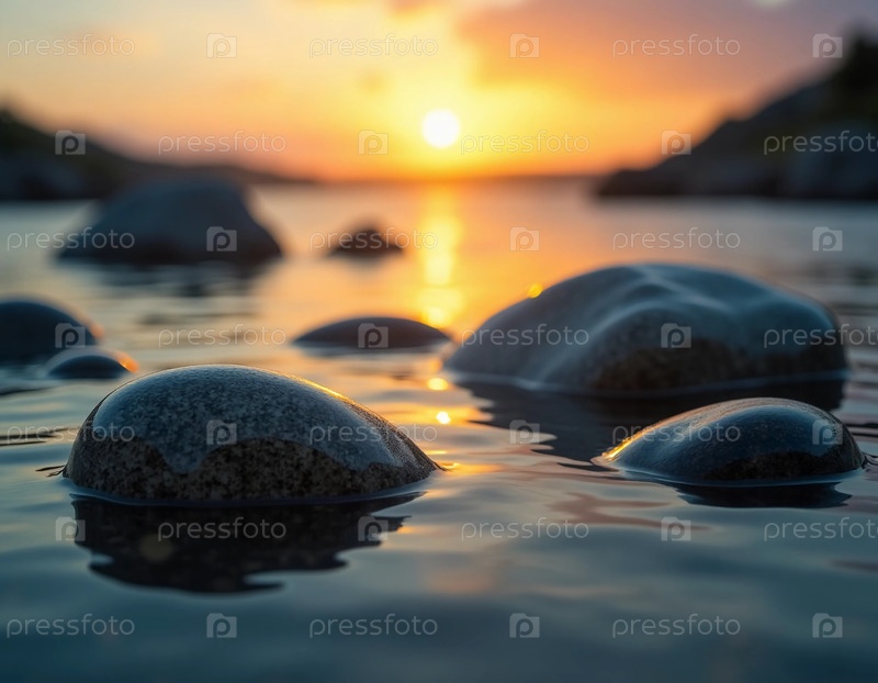 Нежные волны гладят полированные камни при восходе солнца, бросая теплый свет на воду