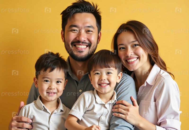 Счастливая семья позирует с яркими улыбками, демонстрируя любовь и связь.Родители держат двух сыновей в руках, создавая радостную атмосферу, наполненную теплом и смехом