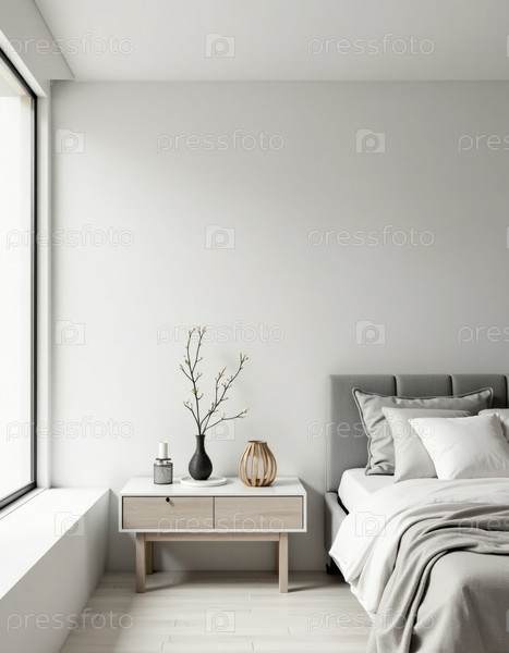 Serenity окружает спальню светлой цветовой палитрой, уютной кроватью, украшенной мягкими подушками и стильным столом с элегантным декором и естественными элементами генеративного AI
