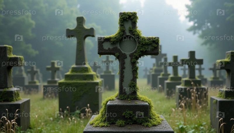 Среди густого тумана моховые покрывала выветривают надгробия на заброшенном кладбище генеративного ИИ
