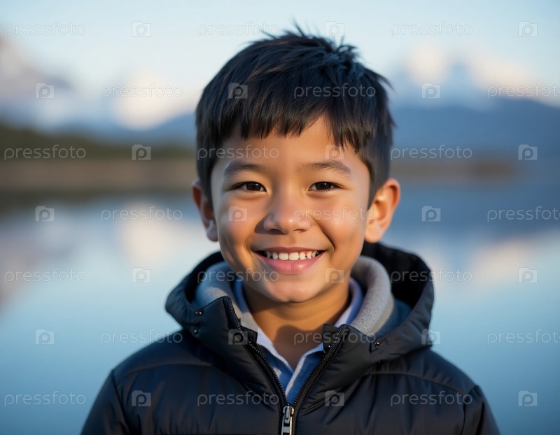 Веселый молодой мальчик с Аляски стоит у безмятежного пруда, демонстрируя свою яркую улыбку