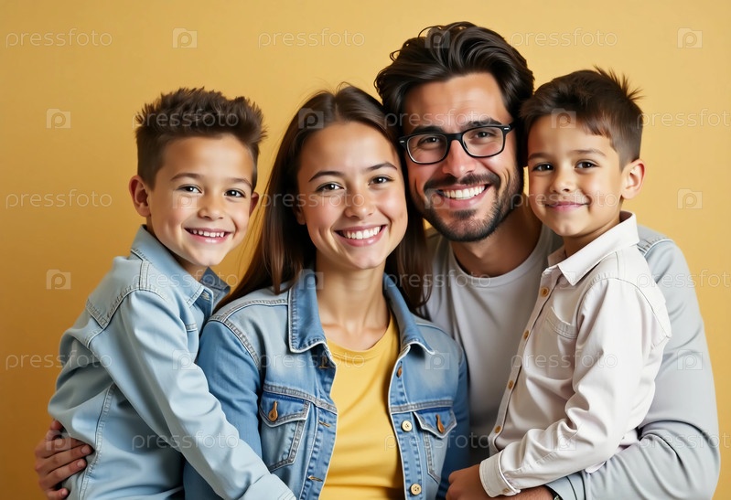 Мама, папа, сын и дочь выражают счастье в уютной домашней обстановке, показывая свою тесную связь и радость