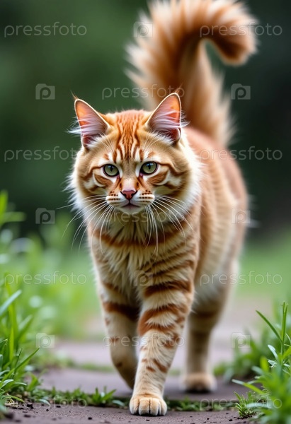 Красивый кот Мэн-Кун уверенно гуляет по садовой тропе, его поразительное оранжевое пальто сверкает на солнце в окружении яркой зелени генеративного ИИ