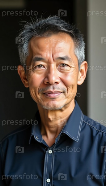 Этот очаровательный портрет изображает китайского мужчину средних лет с теплой улыбкой, раскрывающей мудрость и опыт