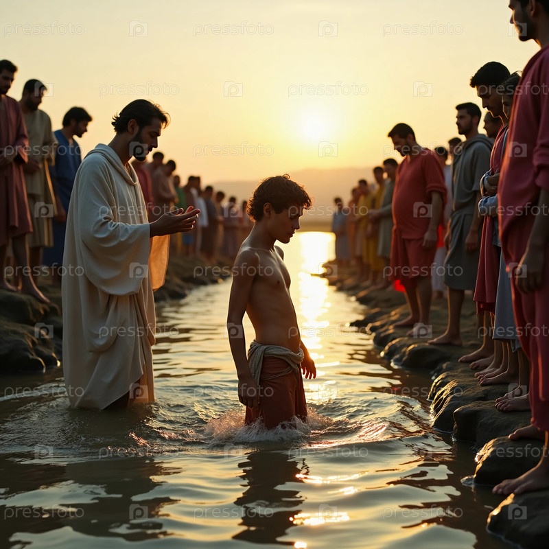 Под спокойным закатом солнца Иисус стоит в реке Иордан, готовясь крестить маленького мальчика, а толпа становится свидетелем этого священного момента, отражающего веру и преданность