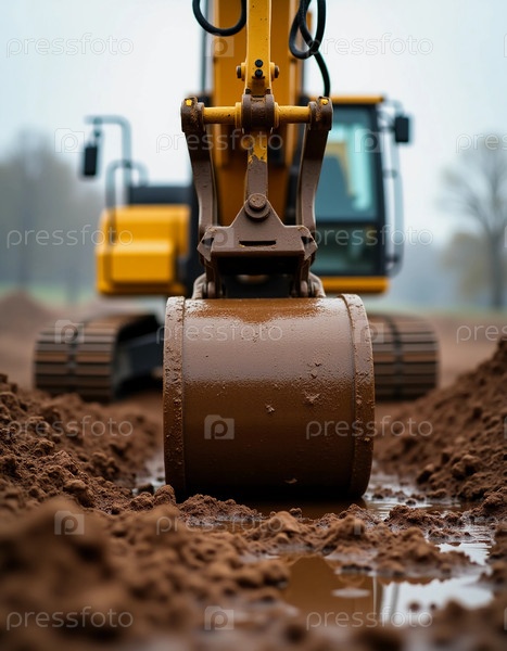 На стройплощадке активно работают тяжелые машины, ведровой экскаватор выкапывает и перемещает влажную почву.Атмосфера облачная, намекая на потенциальные осадки генеративного ИИ