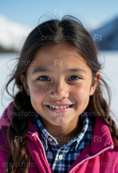 В ярко-розовом куртке молодая девушка из Аляски с сплетёнными волосами радостно смотрит на потрясающий зимний пейзаж генеративного ИИ