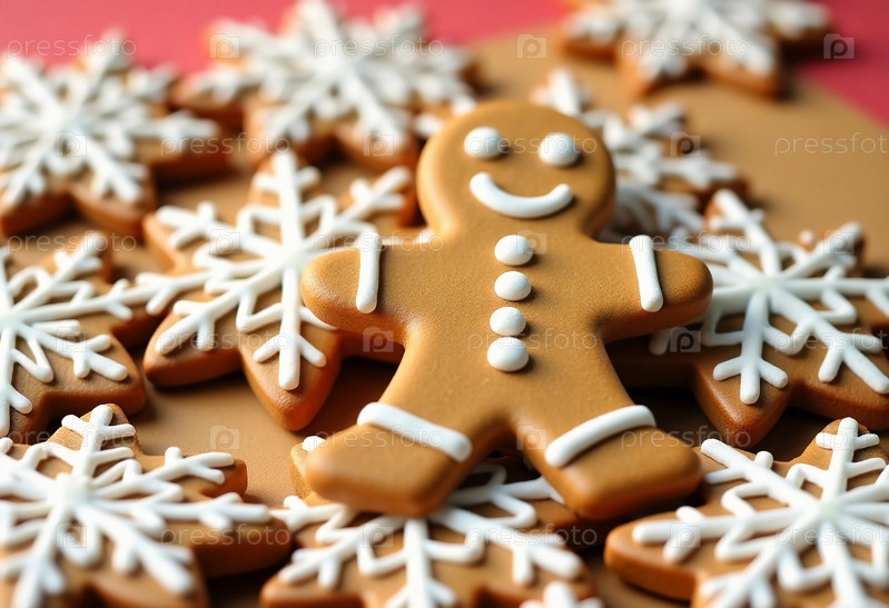 Красочные печенье из пряника лежат на ярко-красной поверхности с сложными украшениями и праздничными формами, идеально подходящими для праздничных собраний и веселых генеративных декораций искусственного интеллекта