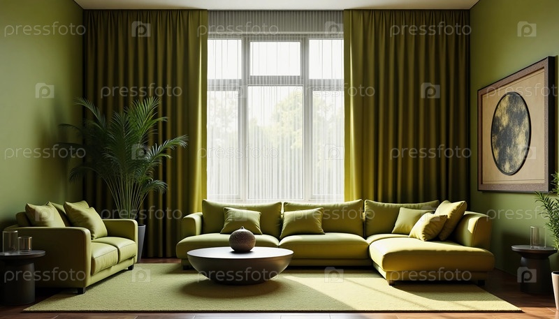 Привлекательная гостиная демонстрирует современную мебель в богатых зеленых оттенках, подчеркиваемых естественным светом через большие окна, создавая спокойную атмосферу для расслабления