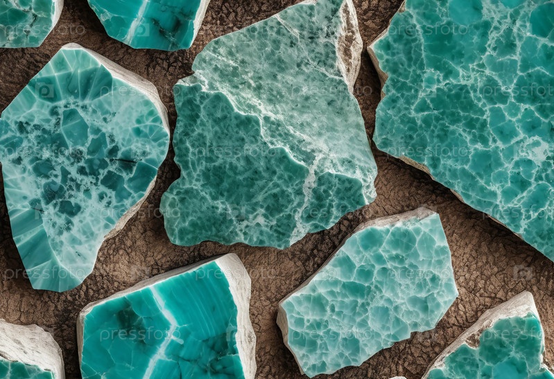 Куски амазонита демонстрируют свои потрясающие бирюзовые оттенки и яркие узоры, приглашая вас оценить их уникальные текстуры и естественное мастерство в различных аранжировках