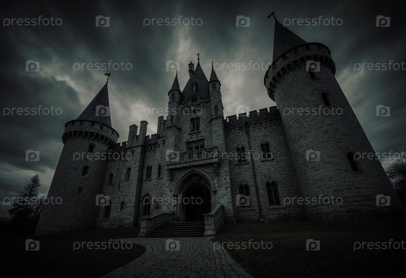 Темный и готический замок стоит высоко под предчувствием неба, усиленным вихревыми облаками.Структура выглядит навязчиво, создавая идеальную сцену для генеративного ИИ в Хэллоуин