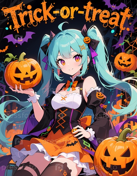 Красочная сцена Хэллоуина показывает персонажа, одетого в праздничный костюм, держащего тыкву, окруженную жуткими декорациями, готовую к трюку или лакомству с волнением генеративного ИИ