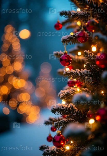 Покрытые снегом вечнозеленые ветви, украшенные ярко-красными орнаментами и мерцающими огнями создают захватывающую праздничную атмосферу в тихом лесу на Новый год