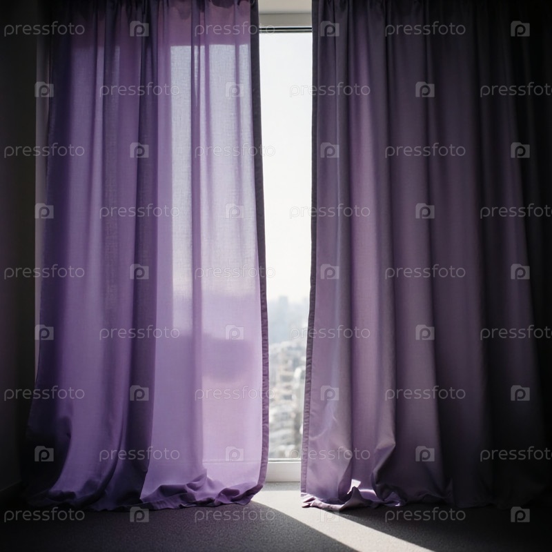 Мягкие фиолетовые шторы мягко раскачиваются в ветре, создавая большое окно с потрясающим видом на город