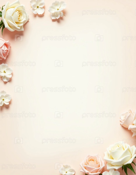 Очаровательное расположение изысканных роз и маленьких белых цветов украшает края мягкого пастельного фона, идеально подходит для создания сердечных сообщений на пустых картах генеративного ИИ