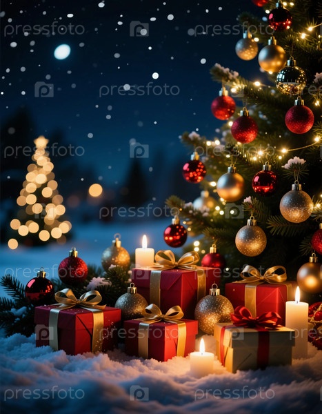 Красиво украшенная рождественская елка светится огнями и декорациями, окружена красочными упакованными подарками и свечами в снежную ночь, идеально подходит для праздничных торжеств генеративного ИИ