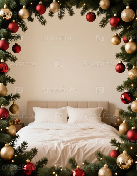 Мягкая кровать, одетая в белое постельное белье, находится в окружении рождественских украшений и зелени, создавая теплую и привлекательную атмосферу для праздничных торжеств