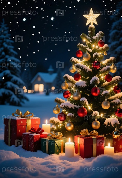 В спокойной зимней стране чудес красиво украшенная рождественская елка стоит в окружении красочных подарков и мерцающих свечей, создавая тёплую праздничную атмосферу ночью