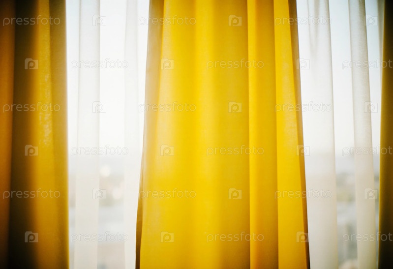 Ярко-желтые шторы украшают окно, создавая веселую атмосферу.Чистые белые занавески добавляют контрастность, смягчая свет, который фильтруется днем