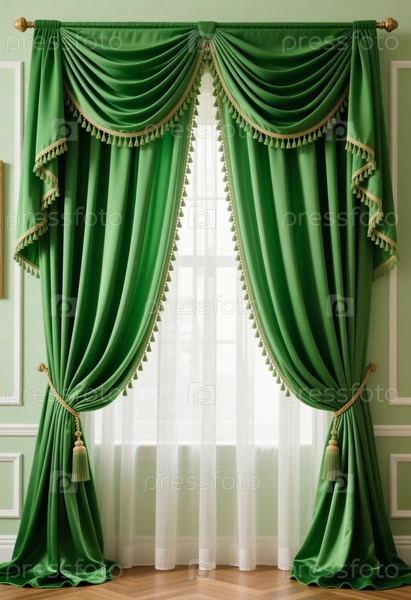 Ярко-зеленые шторы элегантно обрамляют окно, улучшая хорошо освещенную комнату мягким естественным светом.Каскадная ткань красива, создавая теплую атмосферу Generative AI