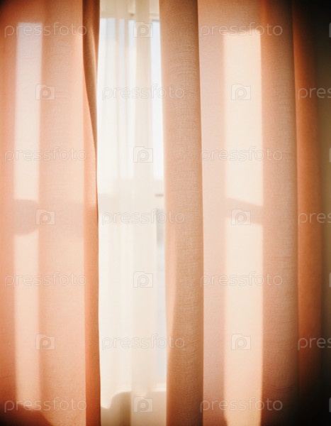 Солнечный свет проникает через чистые шторы в мягких коричневых, бежевых и персиковых тонах, нежно освещая комнату.Свет создаёт теплую и привлекательную атмосферу генеративного ИИ