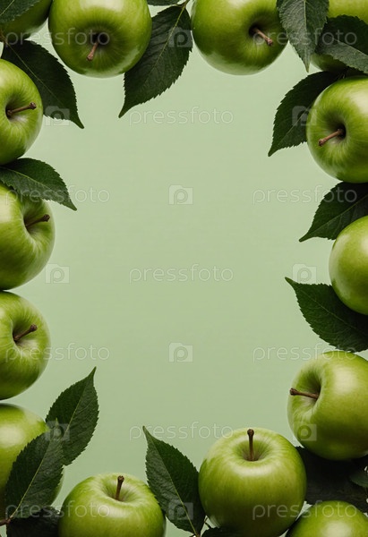 Коллекция свежих зеленых яблок расположена с листьями на мягком зелёном фоне, обеспечивая живое и органическое ощущение, подходящее для различных приложений, включая генеративное украшение ИИ