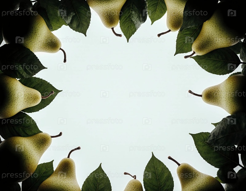 Свежие груши и ярко-зеленые листья создают естественную границу на фоне мягкого света, вызывая спокойную атмосферу, идеально подходящую для любителей природы