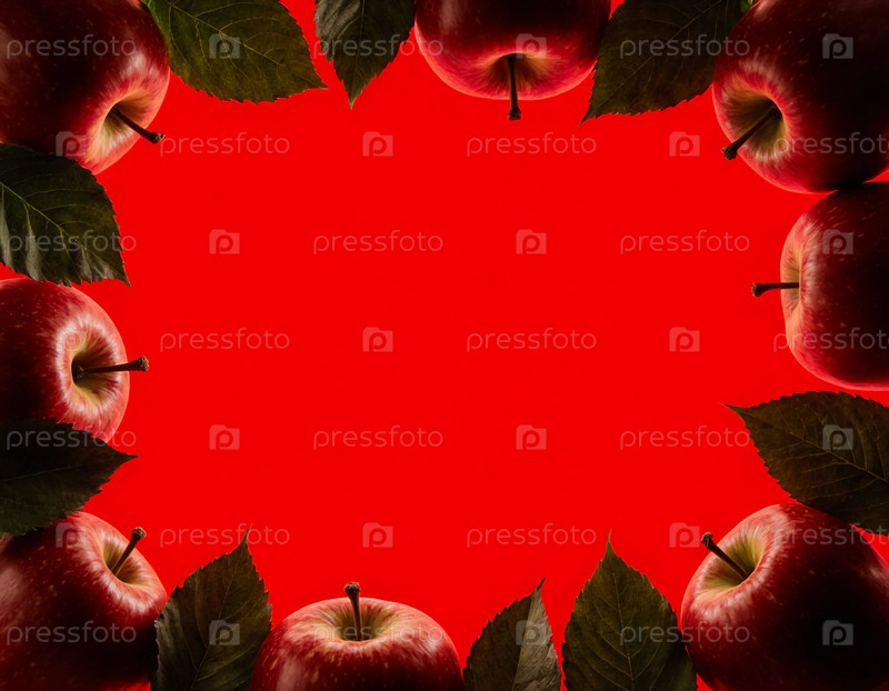 Коллекция свежих красных яблок гнездятся среди зеленых листьев на ярко-красном фоне