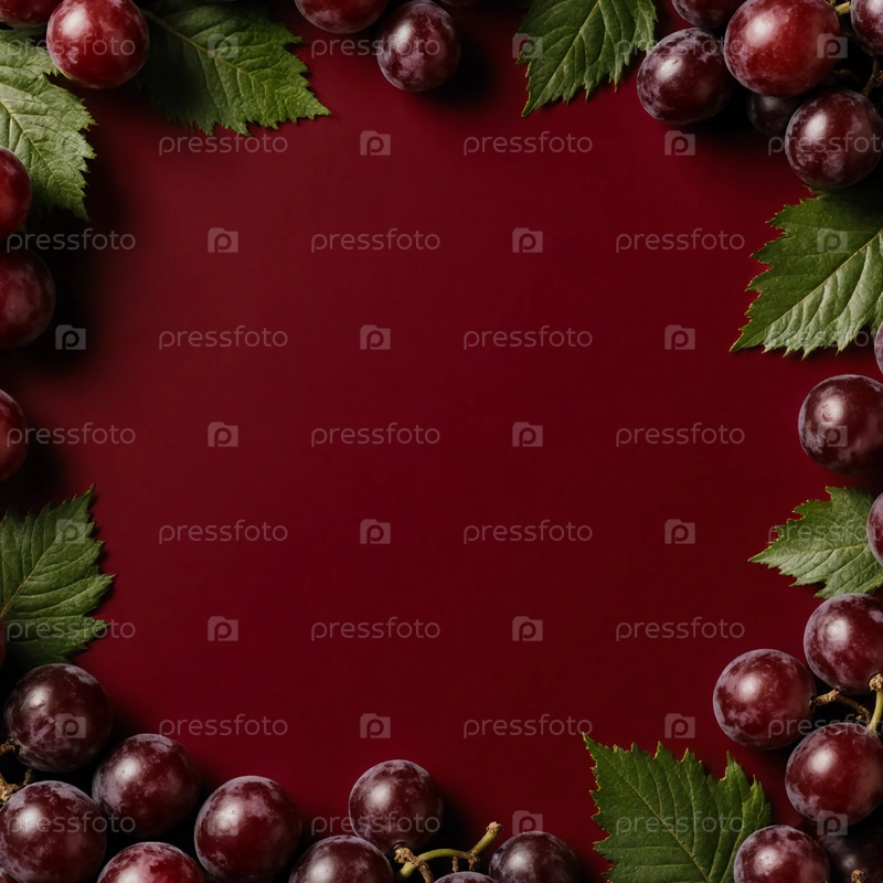 Красивое расположение свежих красных виноград окружает темно-красный фон. пышные зеленые листья улучшают яркий дисплей, создавая естественное чувство генеративного ИИ