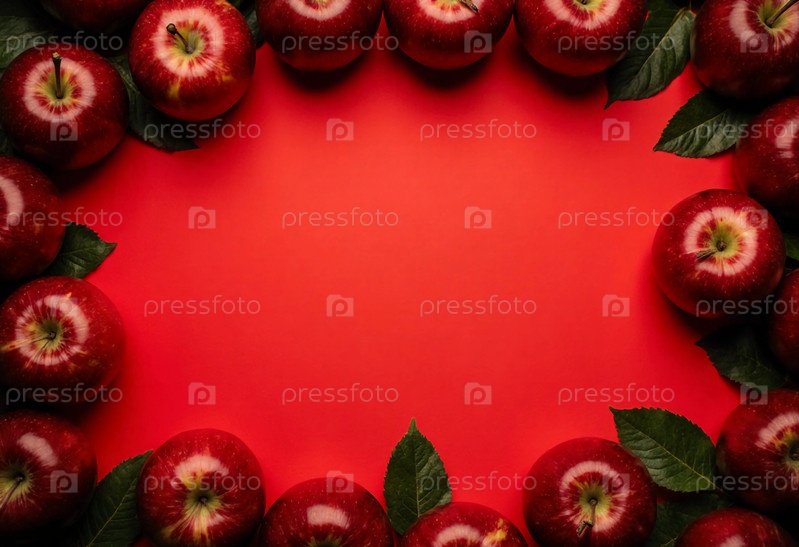 Ярко-красные яблоки расположены в круглой формации на смелом красном фоне.Зелёные листья добавляют свежесть, улучшая осеннюю атмосферу генеративного ИИ
