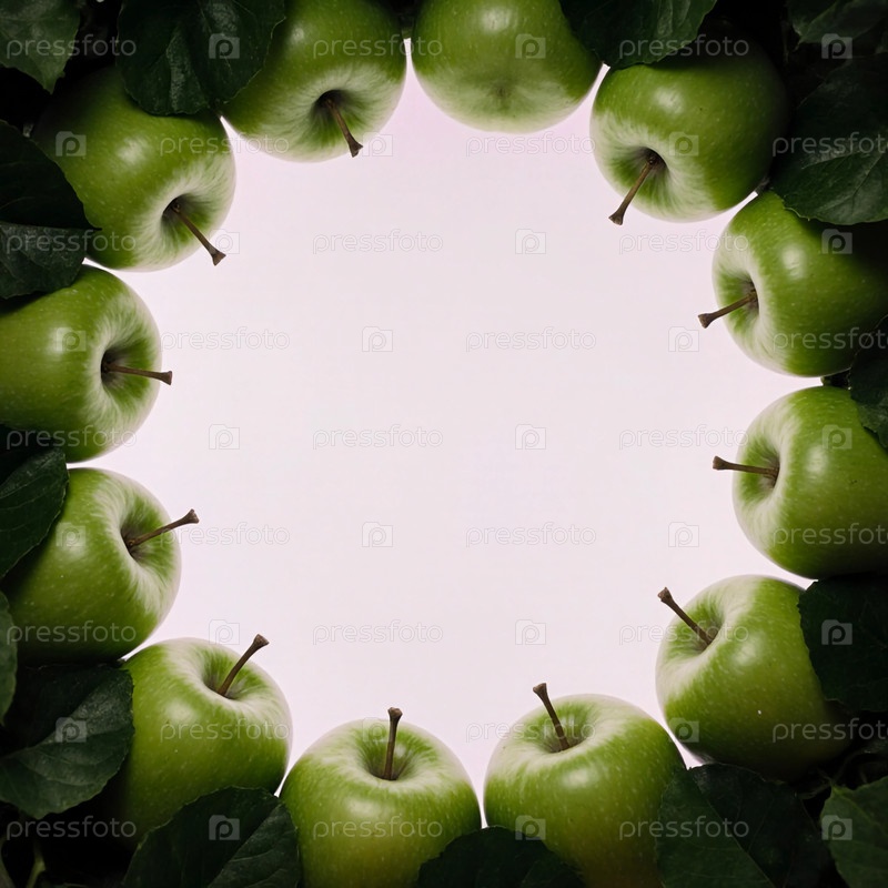 Ярко-зеленые яблоки размещаются в круглом образовании с пышными листьями вокруг них.Фон мягкий, что повышает свежесть и привлекательность генеративного дисплея ИИ
