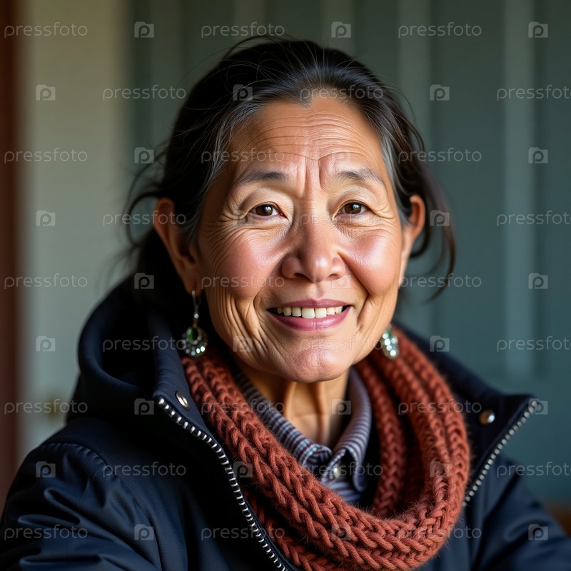 21-летняя женщина с Аляски излучает тепло и мудрость своей нежной улыбкой.Она носит уютный шарф, воплощающий дух ее культуры в мирной обстановке