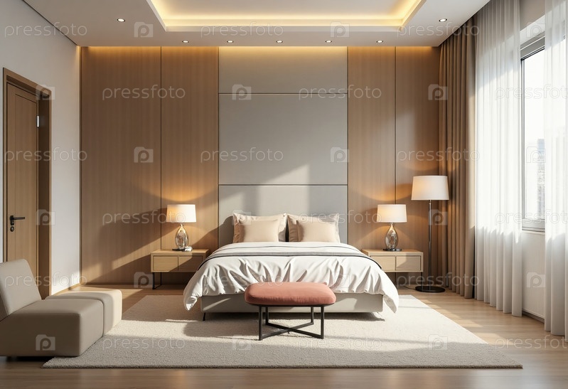 Вдумчивое расположение мягких цветов и минималистической мебели создает спокойную атмосферу в современной городской спальне, освещенной естественным дневным светом и стильными генеративными лампами AI