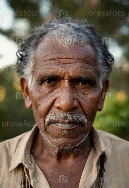 Этот мощный портрет захватывает пожилого аборигена, окруженного природой, излучающей мудрость и жизненные переживания, которые отражают его богатое культурное наследие в Австралии