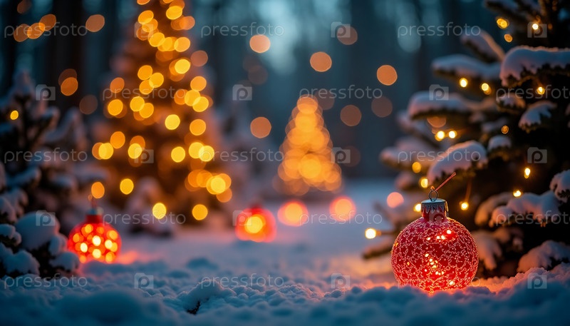 Сверкающие огни и яркие орнаменты усеяли снежный лес, а вечнозеленые растения стояли высоко, создавая живописный фон для праздничного духа новогодних каникул генеративного ИИ