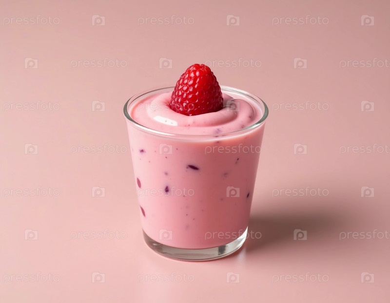 Нарезка малинового йогурта элегантно представлена в прозрачном стекле, демонстрируя его кремообразную текстуру и ярко-розовый оттенок, украшенный одной свежей малиной сверху для генеративного поп-цвета AI