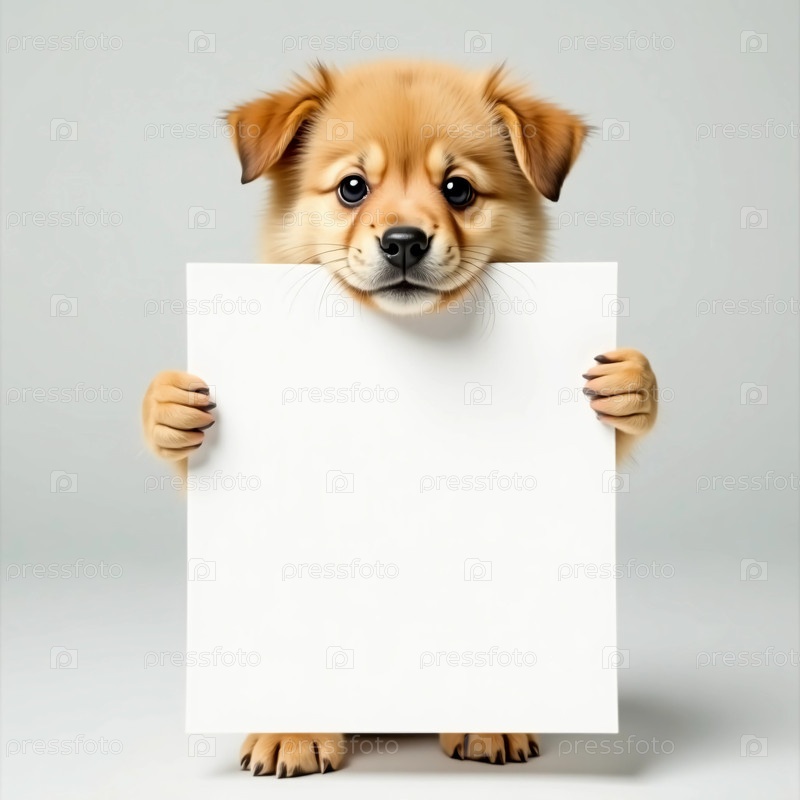 Очаровательное щенко гордо стоит, держит пустой плакат и приглашает к творчеству и воображению.Простое, но очаровательное взаимодействие, которое вызывает радость и вдохновение