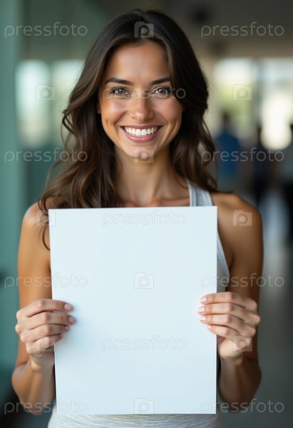 В хорошо освещенной обстановке веселая женщина демонстрирует чистый плакат, приглашая к творчеству и вдохновению.Ее сияющая улыбка отражает теплоту и открытость, соединяясь с аудиторией